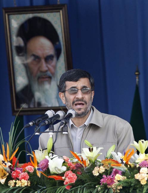 9月22日,伊朗士兵在德黑兰举行的纪念伊朗和伊拉克战争爆发29周年仪式上接受检阅。1980年9月22日,伊朗和伊拉克两国爆发战争,史称“两伊战争”。图为伊朗总统艾哈迈迪-内贾德在仪式上讲话。
