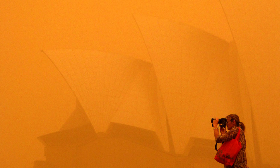 澳大利亚悉尼23日出现罕见的沙尘暴,加上风速每小时上百公里的强风吹袭,全城笼罩在一片橘红色的尘雾中,由于能见度相当低,飞机和渡轮暂时停飞或停驶。