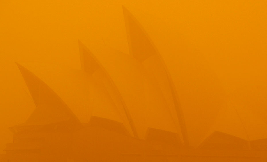 澳大利亚悉尼23日出现罕见的沙尘暴,加上风速每小时上百公里的强风吹袭,全城笼罩在一片橘红色的尘雾中,由于能见度相当低,飞机和渡轮暂时停飞或停驶。