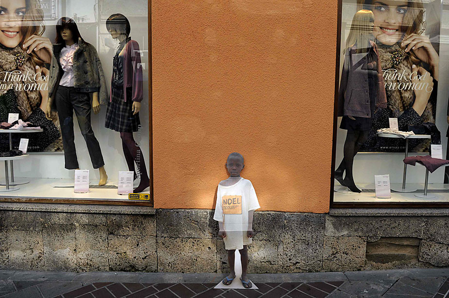 在斯洛文尼亚的卢布尔雅那街头,联合国儿童基金会放置了一个小乞丐的图片纸板,以引起人们关注那些身处困境的卢旺达儿童。图片来源:中国新闻网