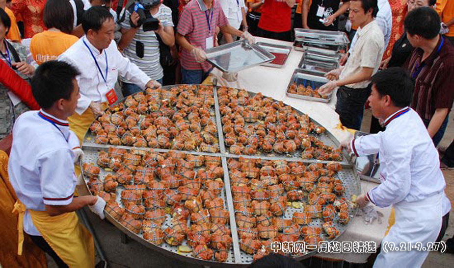 9月26日,苏州唯亭镇阳澄湖大闸蟹开捕节上一口直径2米的大锅一次蒸出2009只大闸蟹,并邀请苏沪杭三地市民到场共同品蟹。图片来源:中国新闻网