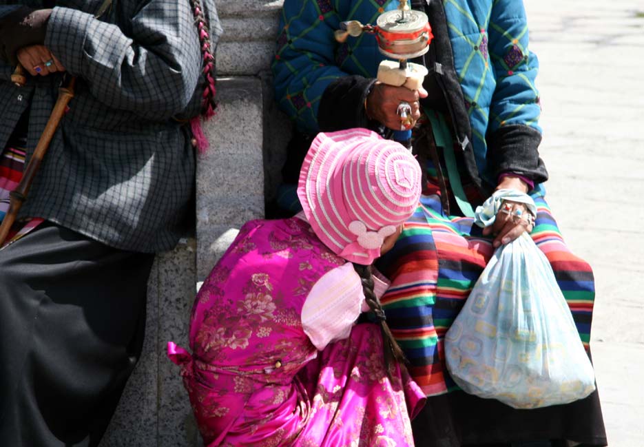 穿着藏袍的小姑娘躲闪着记者的镜头,露出帽子上可爱的小花。她身旁是布达拉宫外虔诚的转经者。