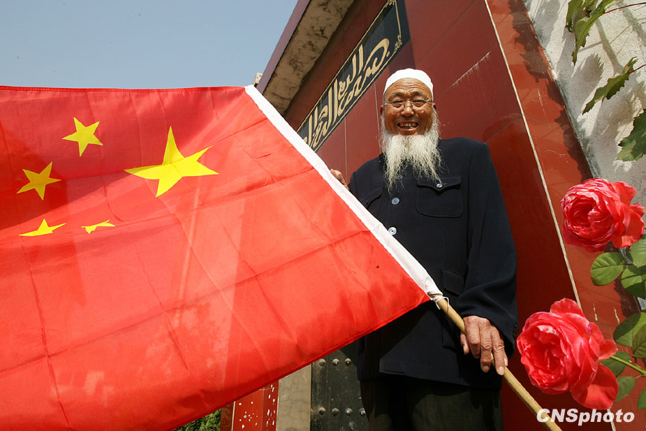 9月下旬,河南省济源市庙后居委会73岁的回族老汉闪登平在自家门口悬挂国旗,喜迎国庆佳节。 中新社发 卫建波 摄
