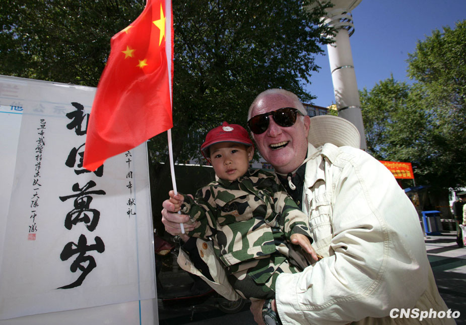 9月27日上午,为迎接国庆60周年,武警西藏总队官兵为驻地群众开展拥政爱民、服务群众便民活动。一位外国游客抱着中国孩子,在武警官兵的书法作品“祖国万岁”前,一起摇动五星红旗,共庆新中国国庆60周年。 中新社发 钱檬 摄