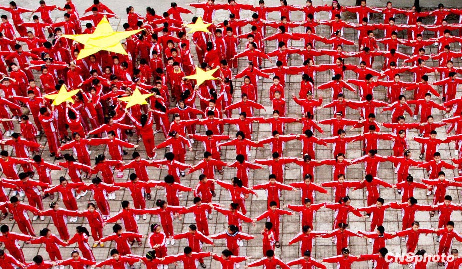 9月22日,江西省德兴市铜矿第二小学1000多名小学生,身穿红色校服,排列整齐的在校园内组成了一个长42米、宽28,总面积达1170多平方米的巨型国旗,为迎接建国60周年喝彩,同时也让同学们上了一堂爱国主义教育课。 中新社发 卓忠伟 摄