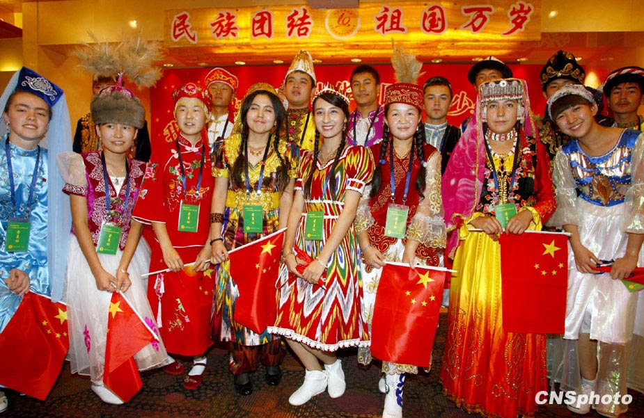 9月24日晚,“我爱我的祖国——中华各民族青少年同心营”在北京开营。本次同心营活动从全国56个民族中挑选男女各一名优秀学生代表共计112人进京参加,在北京期间,营员们不仅将与北京少先队员一起绣国旗,国庆当天,他们将穿上本民族的服饰,组成“国旗礼仪队”,簇拥在天安门广场国旗旗杆下,代表56个民族的青少年共迎国旗。中新社发 郑雄增 摄