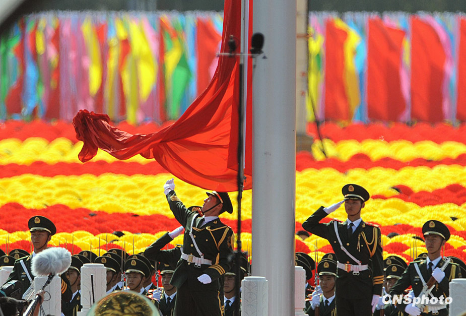 2009年10月1日,中华人民共和国成立60周年庆祝大会在北京天安门广场举行。图为升旗仪式。中新社发 廖攀 摄