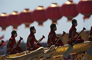 2009年10月1日,中华人民共和国成立60周年庆祝大会在北京天安门广场举行。60响礼炮声中,国旗护卫队托枪从人民英雄纪念碑出发正步行进169步,护送国旗至天安门广场升旗处,寓意从1840年至今,169年来中华民族的不平凡历程。 中新社发 赵振清 摄