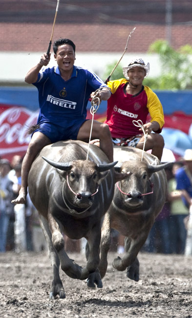 泰国举行别开生面的骑水牛大赛