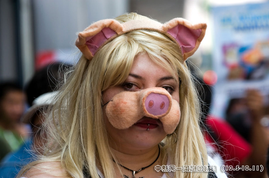 10月4日,在墨西哥首都墨西哥城,参加世界动物日活动的人们头带面具,手举图片,呼吁人们关注动物权益。来源:中国新闻网