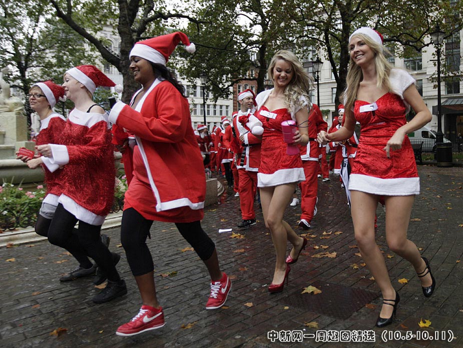 10月6日,英国伦敦市中心100多位圣诞老人为筹集乳腺癌护理善款而参加欢乐跑活动。来源:中国新闻网