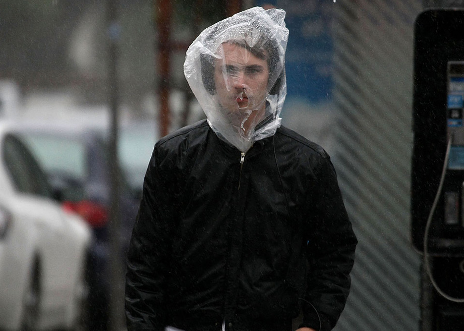 周二(10月13日),美国旧金山街头一位行人用塑料袋套在头上,抵挡暴雨。图片来源:中国新闻网