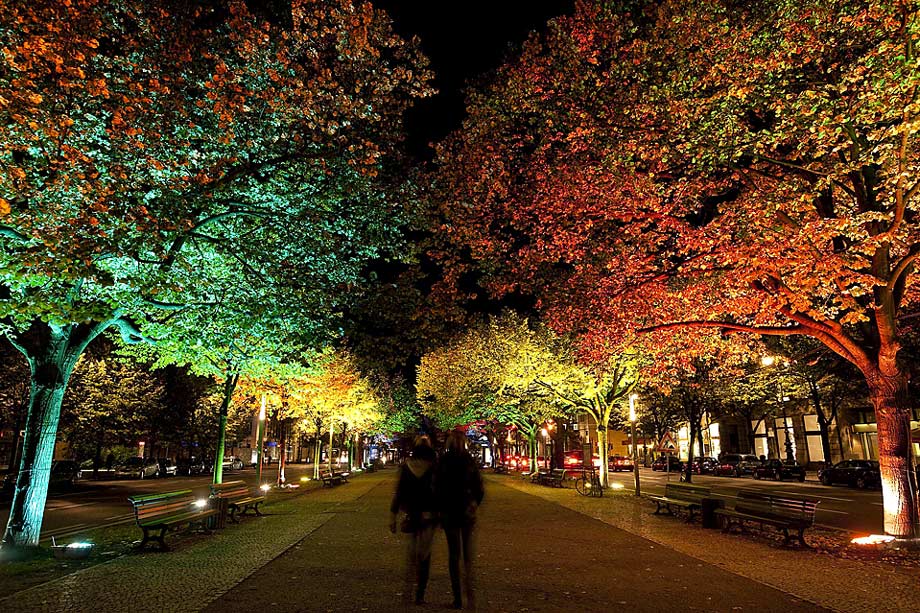 周二晚(10月13日),德国首都柏林,著名的林荫大道“菩提树下大街”在“灯节”预演中被五彩灯饰照亮。10月14日德国柏林迎来一年一度的“灯节”。图片来源:中国新闻网