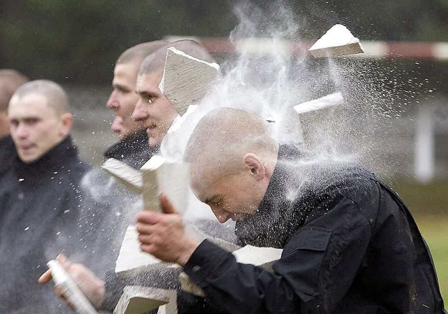 周三(10月14日),白俄罗斯一名士兵在军营里展示他的“铁头功”。图片来源:中国新闻网