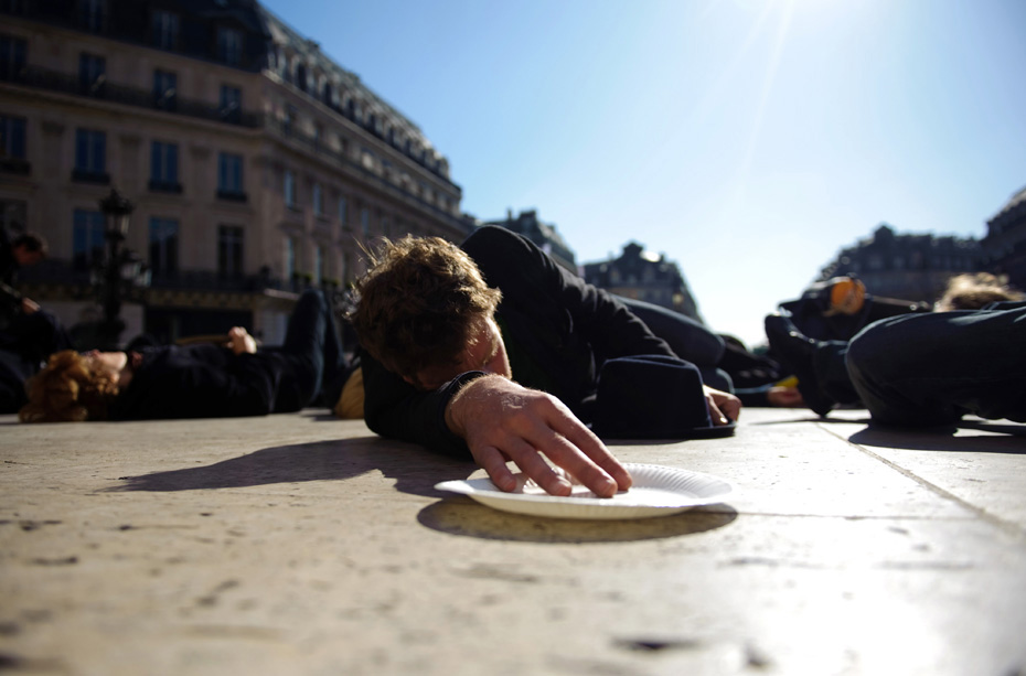周四(10月15日),示威者身穿黑色衣服、手持空盘子在巴黎歌剧院前抗议。他们此举是为了呼吁人们关注世界上的饥民。 10月16日是世界粮食日,今年的主题是“应对危机,实现粮食安全”。 图片来源:中国新闻网