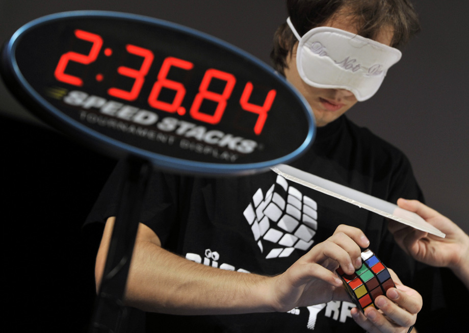 图为一名参赛者在参加盲赛。10月18日,匈牙利魔方大赛在首都布达佩斯举行,各路魔方高手展开对决。图片来源:中国新闻网