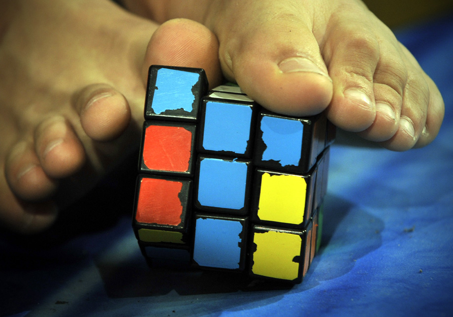 图为一名参赛者在用脚玩转魔方。10月18日,匈牙利魔方大赛在首都布达佩斯举行,各路魔方高手展开对决。图片来源:中国新闻网