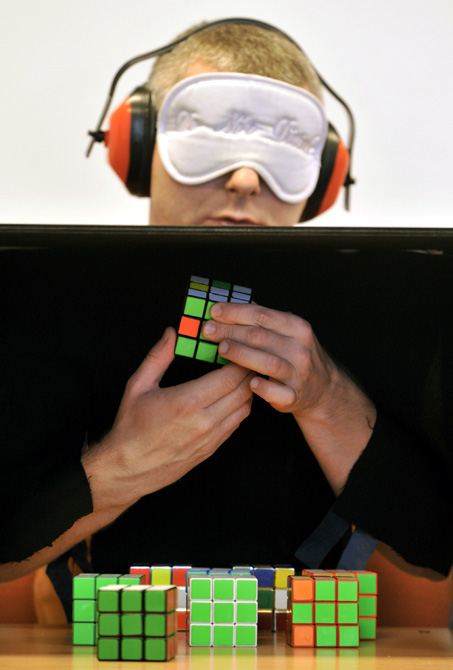 图为一名参赛者在参加盲赛。10月18日,匈牙利魔方大赛在首都布达佩斯举行,各路魔方高手展开对决。图片来源:中国新闻网