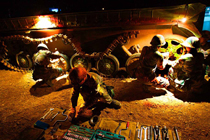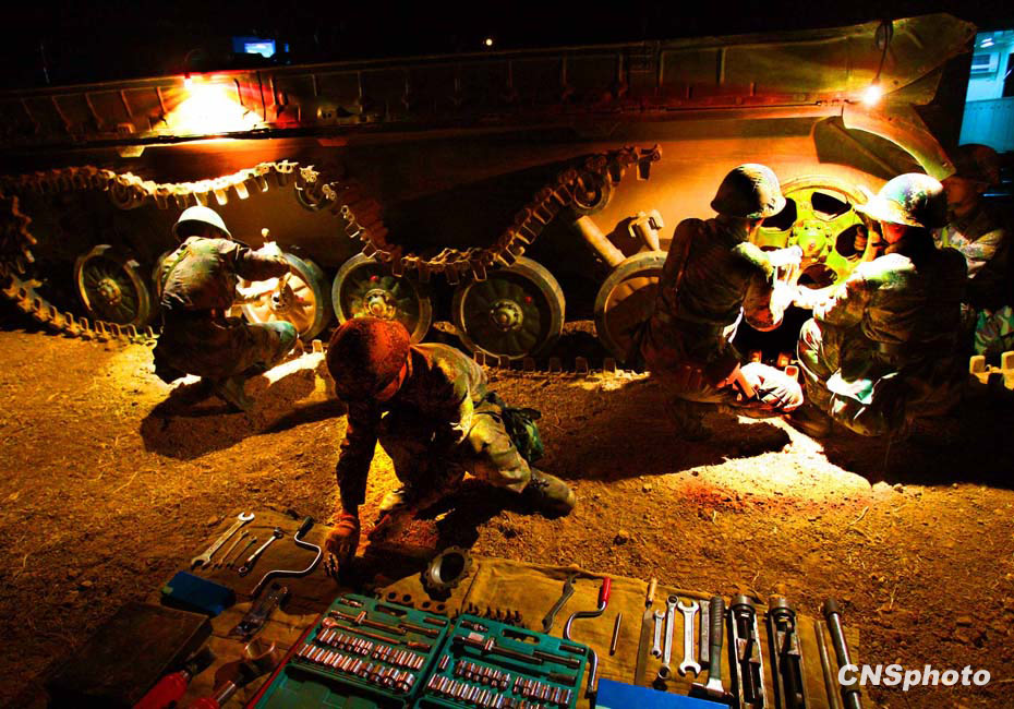 当晚国防大学防务学院、空军指挥学院的外军学员,以及英国、以色列、土耳其、巴基斯坦等国军事观察员亲临现场观摩了后勤保障战斗准备、自行榴弹炮占领阵地、装甲车辆“摸黑”开进等战斗要素。图为战地抢修装甲战车。中新社发 宋吉河 摄