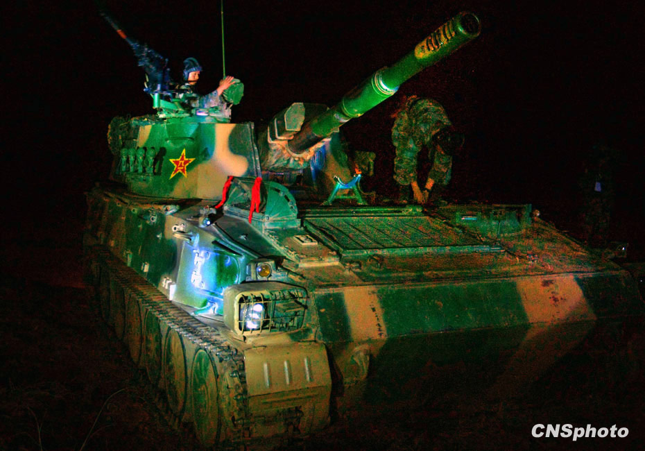 当晚国防大学防务学院、空军指挥学院的外军学员,以及英国、以色列、土耳其、巴基斯坦等国军事观察员亲临现场观摩了后勤保障战斗准备、自行榴弹炮占领阵地、装甲车辆“摸黑”开进等战斗要素。图为“摸黑”进入阵地的主战坦克。中新社发 宋吉河 摄
