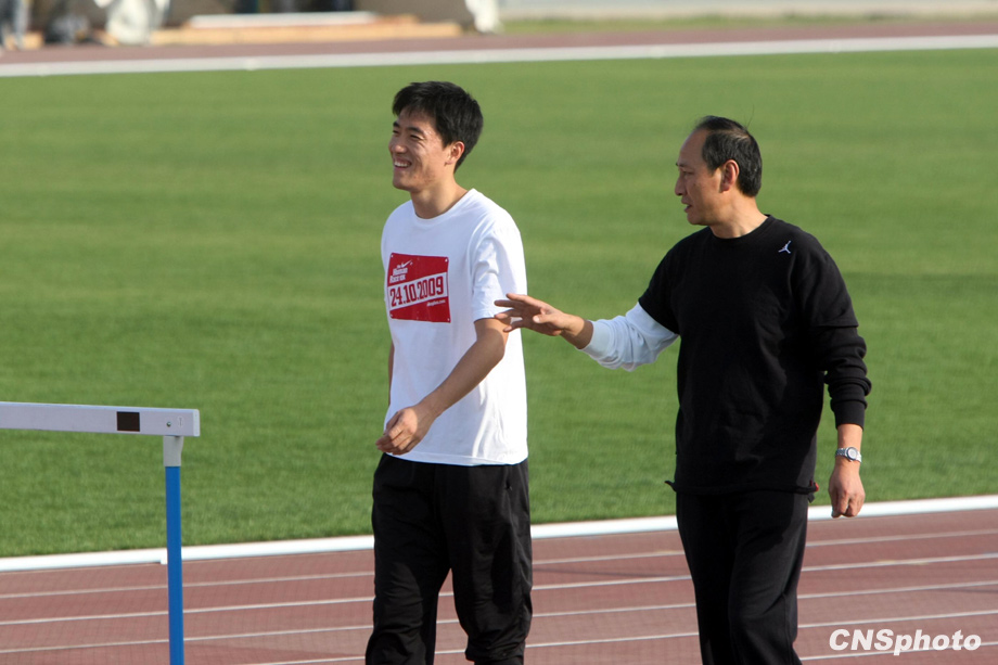 10月22日下午,“飞人”刘翔亮相济南奥体中心田径训练场,在教练孙海平的带领下,轻松备战全运会。来源:中国新闻网