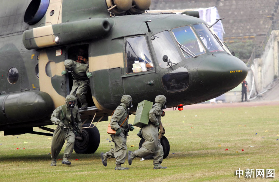 首先赶到现场的是一架米—171直升机,4名防化侦察员全身防护状态下依次着陆。着陆后,其中2人实施先期侦察,简单了解情况后对商场外空气、进出道路及商场外部设施进行侦察,初步查明遭袭情况,并采集收取样品;另外2人指导公众防护并协助组织撤离危害区。 郝飞 摄