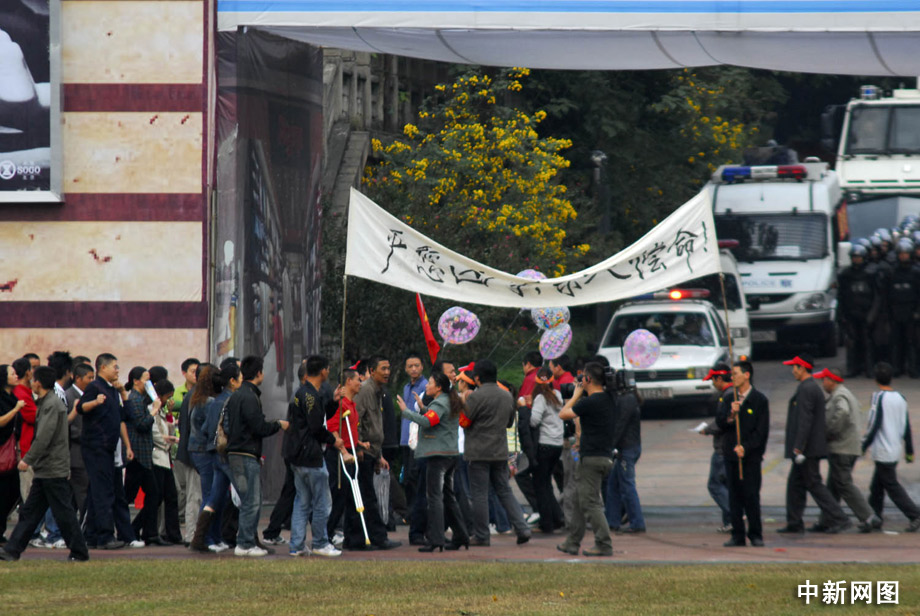 在演练现场,重庆发生“生化袭击事件”,侦破工作正在进行时,受害人家属以赔偿和严惩凶手为由进行非法游行,堵塞交通和大型商场通道,扰乱交通秩序和正常经营,引来大量群众围观。 郝飞 摄
