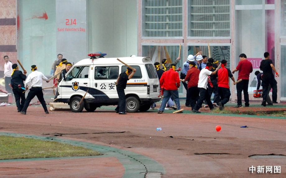 陆续涌来的“暴徒”,带来了铁棍、长刀、铁链等凶器,并结伙围打执勤民警,出现摔、砸商业设施和投掷矿泉水瓶等行为,在广场上出现了反动标语,“暴徒”不断叫嚣反动语言,引发附近众多群众围观,闹事人群已达200余人。曹多然 摄