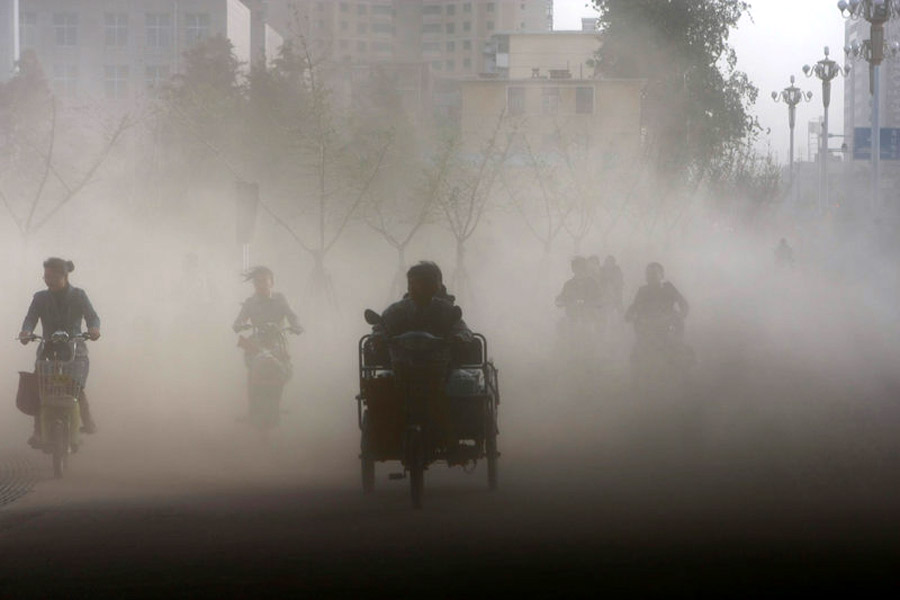 周日(18日), 河北石家庄,中华大街与裕华路交口,自行车在大风引起的扬尘中艰难前行。10月18日起,北方迎来大幅降温,部分地区风力将达8级。 阿拉尔 摄
