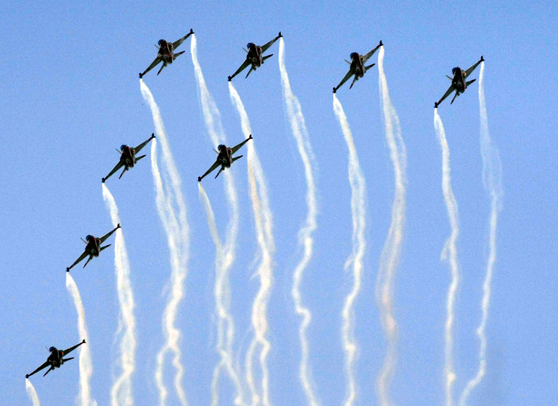 周二(20日),韩国黑鹰特技飞行表演队在2009首尔国际航空航天与国防展上进行精彩的特技飞行表演。 来源:中国新闻网