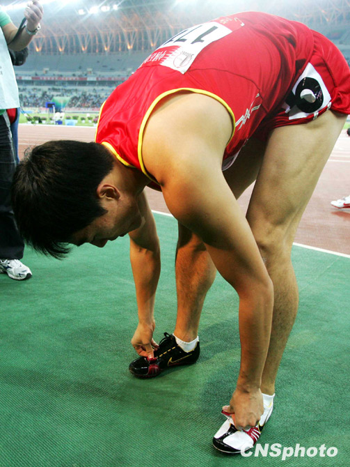 10月24日晚,全运会110米栏预赛在济南奥体中心举行,“飞人”刘翔以13秒75成绩轻松晋级决赛。图为在比赛结束后刘翔解开了鞋带。 中新社发 富田 摄