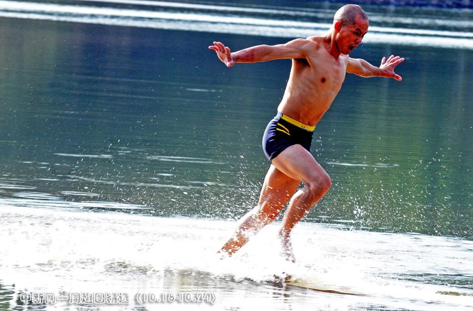10月19日,因少林“一指禅”而名声大噪的泉州南少林寺武僧释理亮再次挑战传说中的少林轻功“水上漂”。傅丹丹 摄>>点击观看详细内容