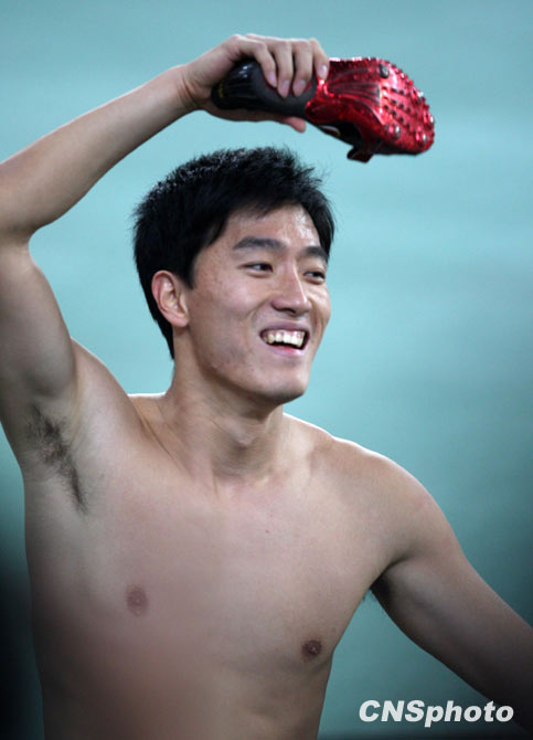 10月25日,在全运会田径男子110米栏决赛中,上海代表团选手、“中国飞人”刘翔以13秒34的成绩勇夺冠军,同时也成就了其全运会该项目三连冠的伟业。中新社发 汤彦俊 摄
