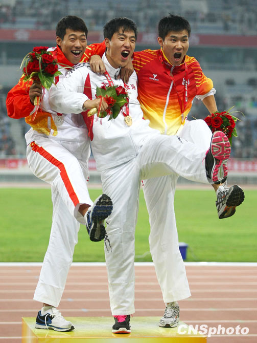 10月25日,在全运会田径男子110米栏决赛中,上海代表团选手、“中国飞人”刘翔以13秒34的成绩勇夺冠军,同时也成就了其全运会该项目三连冠的伟业。