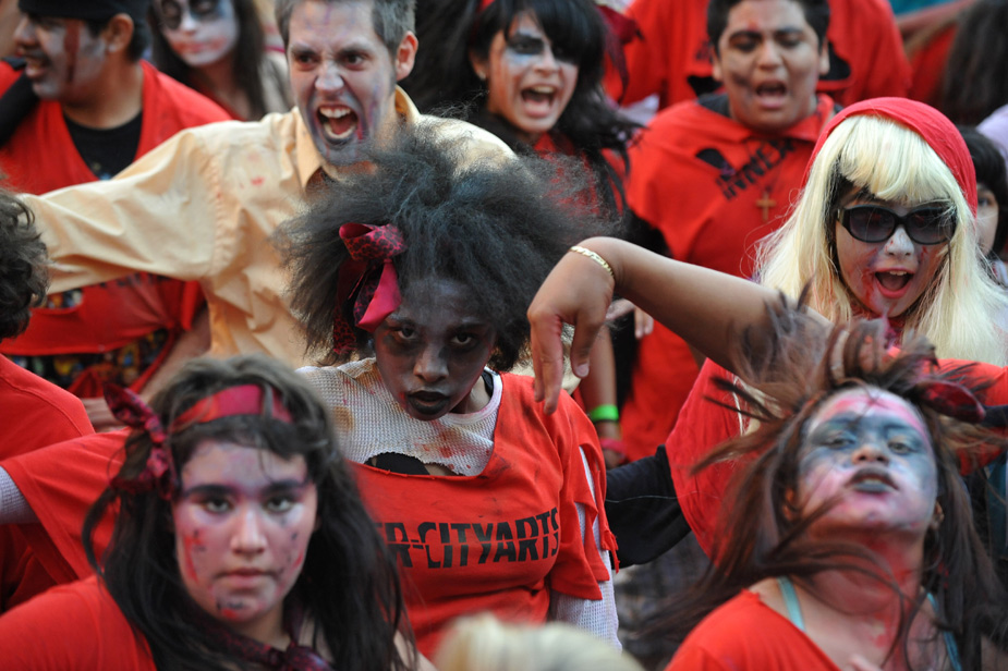 25日,“战栗全世界”活动在全球300多座城市同期举行,全球一共有大约20000人同时跳起了迈克·杰克逊著名的战栗舞。歌迷们借此表达了对这位流行音乐之王的哀思。并且刷新了全世界最多人同时跳舞的世界纪录。图为在美国洛杉矶,歌迷跳起“战栗舞”。