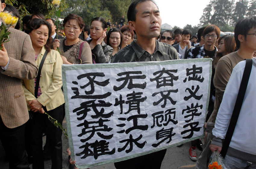 图为自发前来祭奠的市民。10月28日上午,湖北荆州市在市殡仪馆举行隆重追悼大会,悼念陈及时、何东旭、方招三位舍己救人大学生。数万群众赶到追悼会现场,手捧菊花为英雄道别。 熊波/CFP