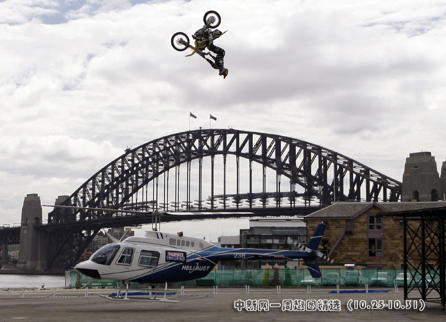 10月28日,在澳大利亚悉尼著名的港湾大桥附近,美国人特拉维斯·帕斯切拉驾驶摩托车成功从一架盘旋的直升机上空飞过。特拉维斯是一位著名的极限运动玩家,此次是为一个电视节目做推广。>>点击观看详细内容