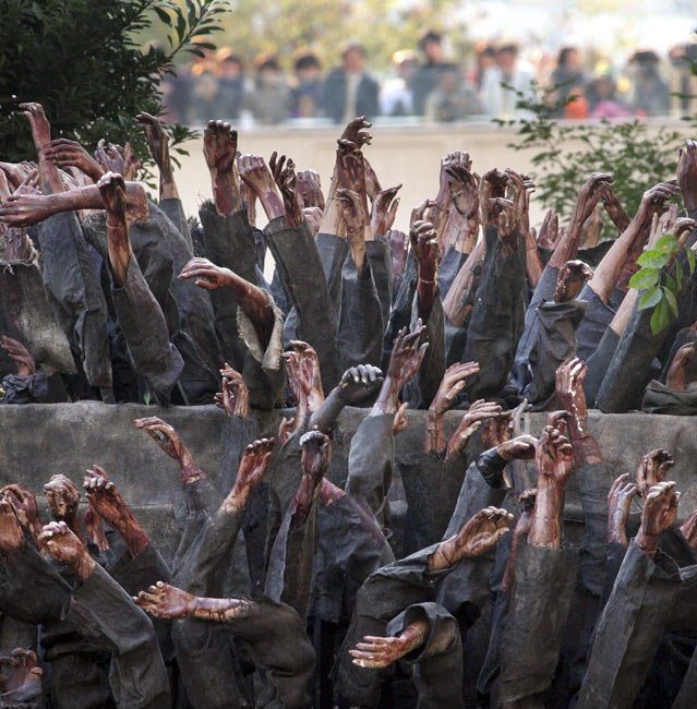 10月31日是西方的“万圣节”,世界各地的群众穿着奇异的服饰、打扮鬼魅的造型迎接“鬼节”的到来。图为在日本东京,人们采用怪异的方式迎接鬼节的到来。