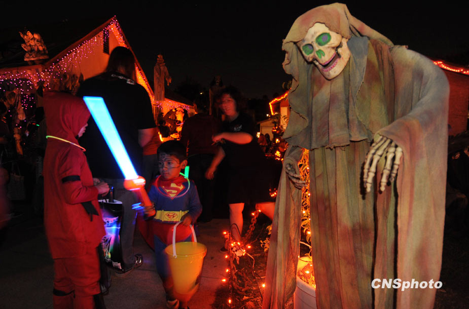 10月31日是西方的“万圣节”,世界各地的群众穿着奇异的服饰、打扮鬼魅的造型迎接“鬼节”的到来。图为洛杉矶儿童享受“万圣节之夜”的乐趣。 中新社发 张炜 摄
