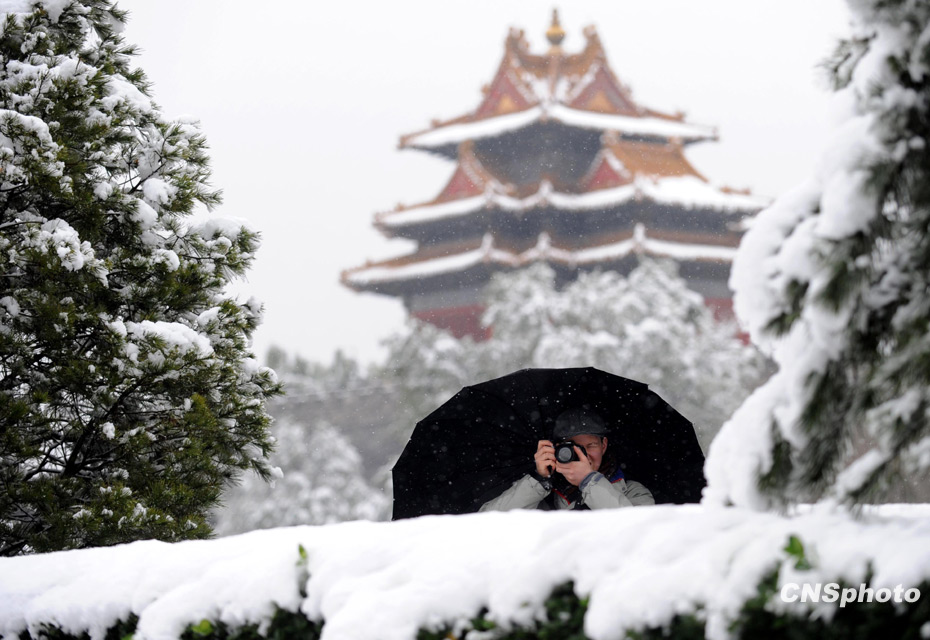11月1日,深秋的北京大雪纷飞银装素裹,一名外国人在故宫角楼附近拍摄雪景。北京今年的初雪时间提前了整整一个月。中新社发 廖攀 摄