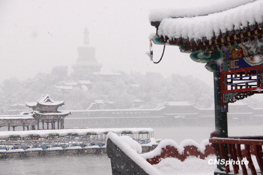 受冷空气影响,十一月一日北京降下今冬首场瑞雪。北海公园大雪纷飞,银装素裹。中新社 发 史利 摄