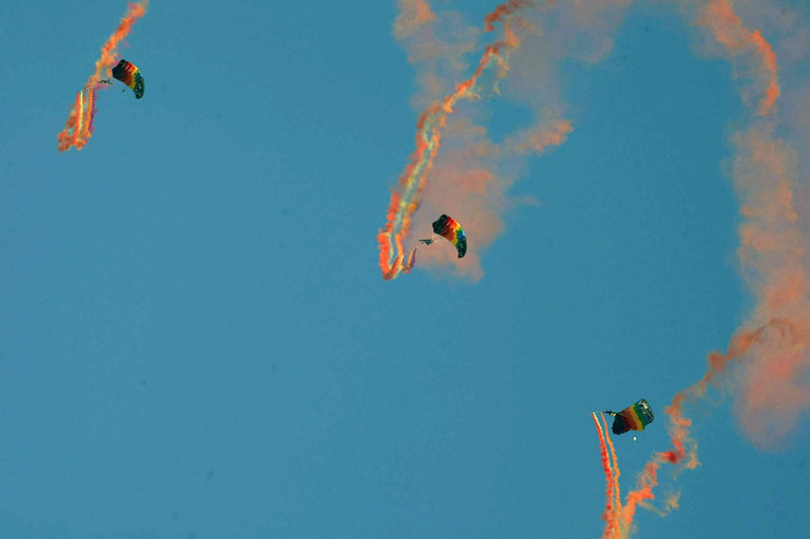 11月3日上午,庆祝空军建军60周年空中表演在沙河机场举行首场预演。八一跳伞队共有24名队员表演开路先锋、空中彩虹、欢庆盛典和仙女下凡4个节目。黑克 张颖川 摄