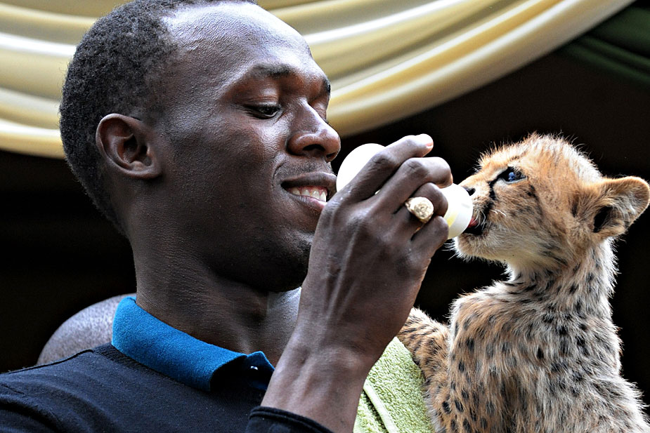 周一(2日),牙买加“飞人”博尔特在肯尼亚野生动物中心收养了一只3个月大的小猎豹,并给其取名为“闪电博尔特”。来源:中国新闻网
