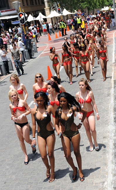 11月7日,南非女性着比基尼沿着梅尔罗斯门大道游行了1690米,在打破吉尼斯世界记录的同时提醒妇女提高防范乳腺癌的意识。图片来源:中国新闻网