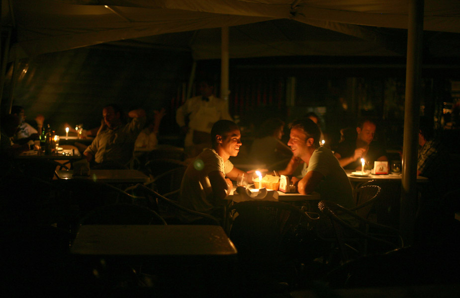 当地时间10日晚,巴西一座大型水电站发生事故,造成多个主要城市停电,其中包括圣保罗和里约热内卢这两个最大的城市。此次停电范围巨大,受影响的除了上述的两个州外,还包括米纳斯吉拉斯州、圣埃斯皮里图州、南马托格罗索州、戈亚斯州和巴西利亚地区。图为在餐馆用餐的人们只能借助蜡烛的亮光。