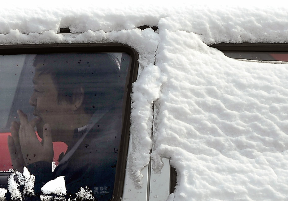 图为一个人坐在大雪覆盖的汽车内。