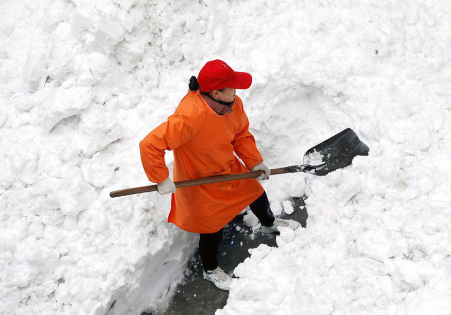 11月12日,河南省汤阴县一居民正在清扫积雪。 中新社发 常中正 摄
