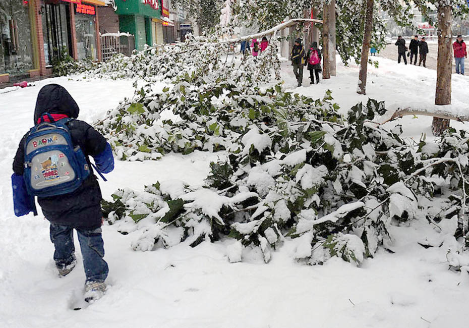 11月12日,一位上学的儿童从一棵被大雪压倒的梧桐树旁走过。 连日来,暴雪不断袭击郑州。大雪给郑州的交通和群众生活造成了严重影响。 王颂 摄 (来源:新华网)