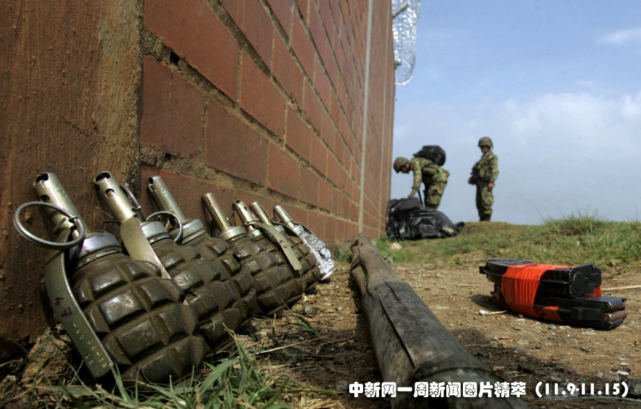 10日(周二),被反叛人员杀死的哥伦比亚士兵的手雷摆放在墙角。图片来源:中国新闻网