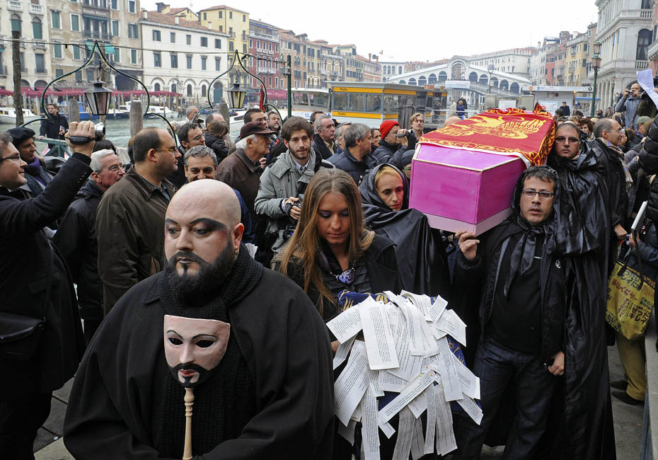 意大利北部历史名城威尼斯人口跌至6万以下,当地剩余的居民14日替自己的城市安排了一场“葬礼”,希望唤起世人对该市当前困境的重视。图片来源:中国新闻网